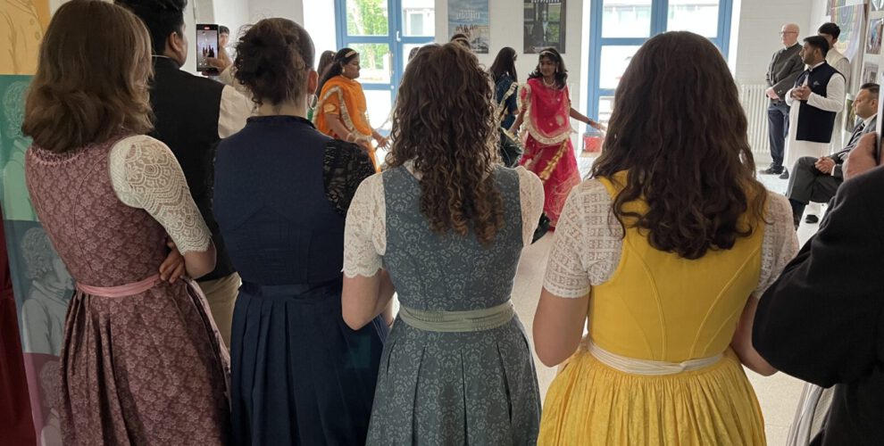 Im Januar waren zehn Schülerinnen mit zwei Lehrerinnen im Rahmen eines Schüleraustauschs mit der CPS Udaipur nach Indien gereist und am 5. Mai trafen nun, spät in der Nacht, die Gäste aus Indien am Münchner Flughafen ein. Ausgeruht kamen die 10 Schüler*innen mit ihren Begleitpersonen und den Organisatoren aus Indien am nächsten Tag zu unserem Wellcome-Nachmittag in unsere Aula. Bei der Deko dominierte Weiß-Blau, beim Buffet bayerische Schmankerl, bei der Kleidung Dirndl, Lederhosen und – zu unserer Überraschung – bei den indischen Gästen farbenfrohe landestypische Kleidung. Sie tanzten mit uns bayerische Volkstänze und wir bestaunten die von den Jugendlichen vorgeführten indischen Tänze. Gerahmt war der Nachmittag von sechs Alphornbläsern. Das hatten die indischen Gäste noch nie erlebt: Sie alle wollten sich mit den Musikern und ihren beeindruckenden Instrumenten fotografieren lassen. Cultural exchange, at its best!